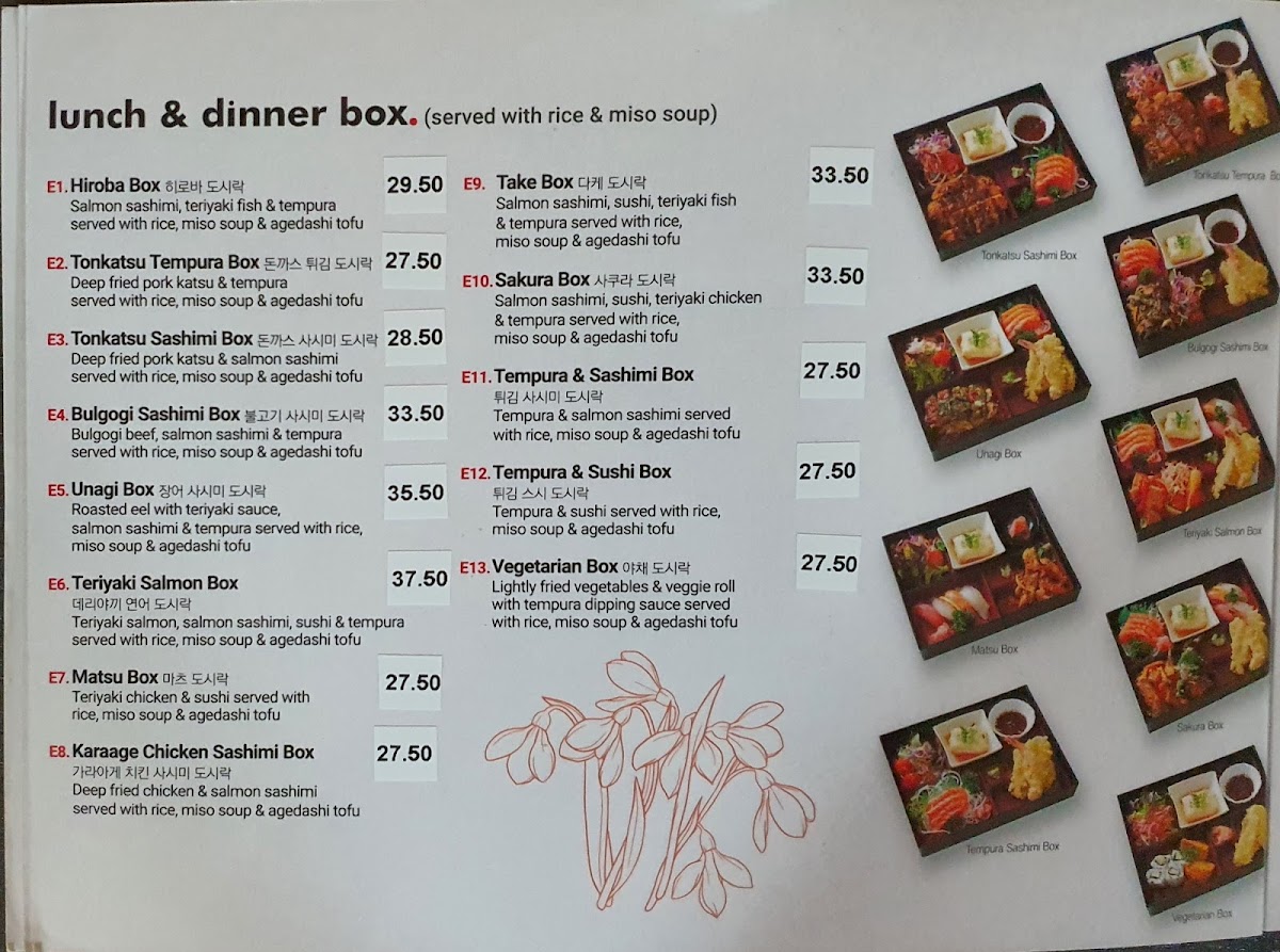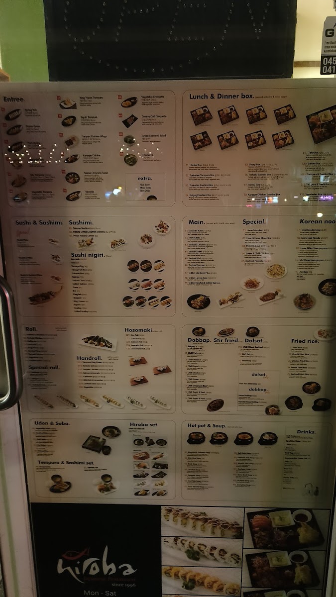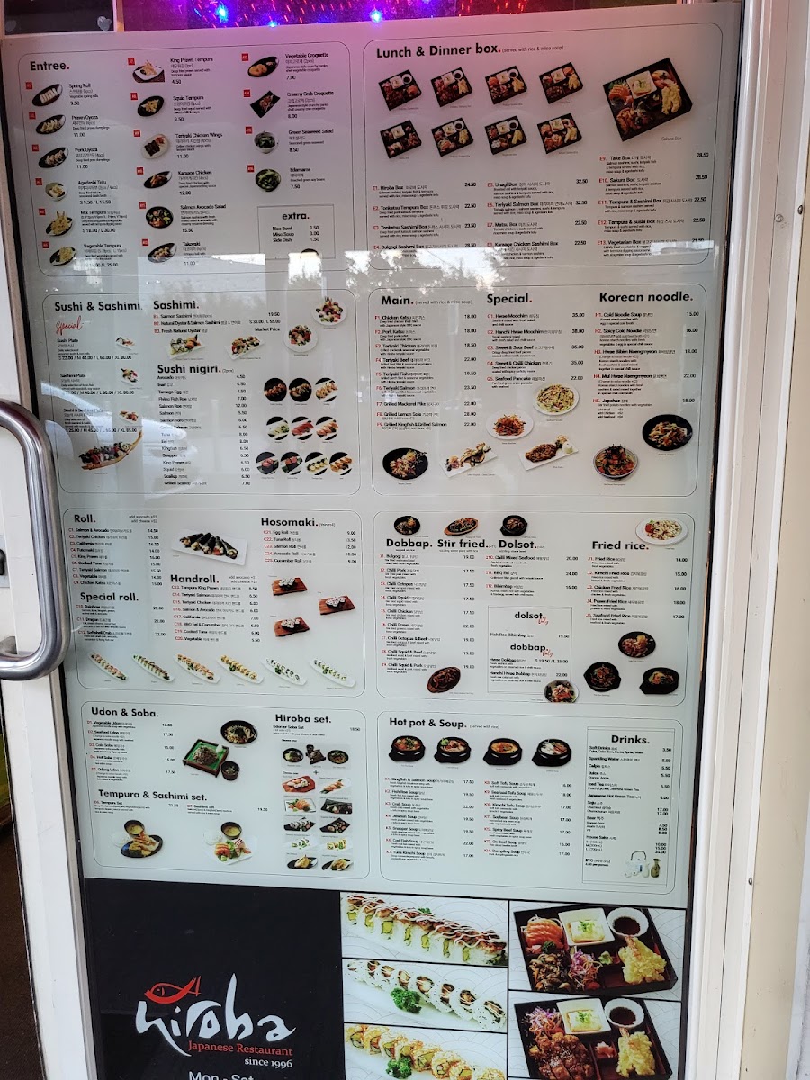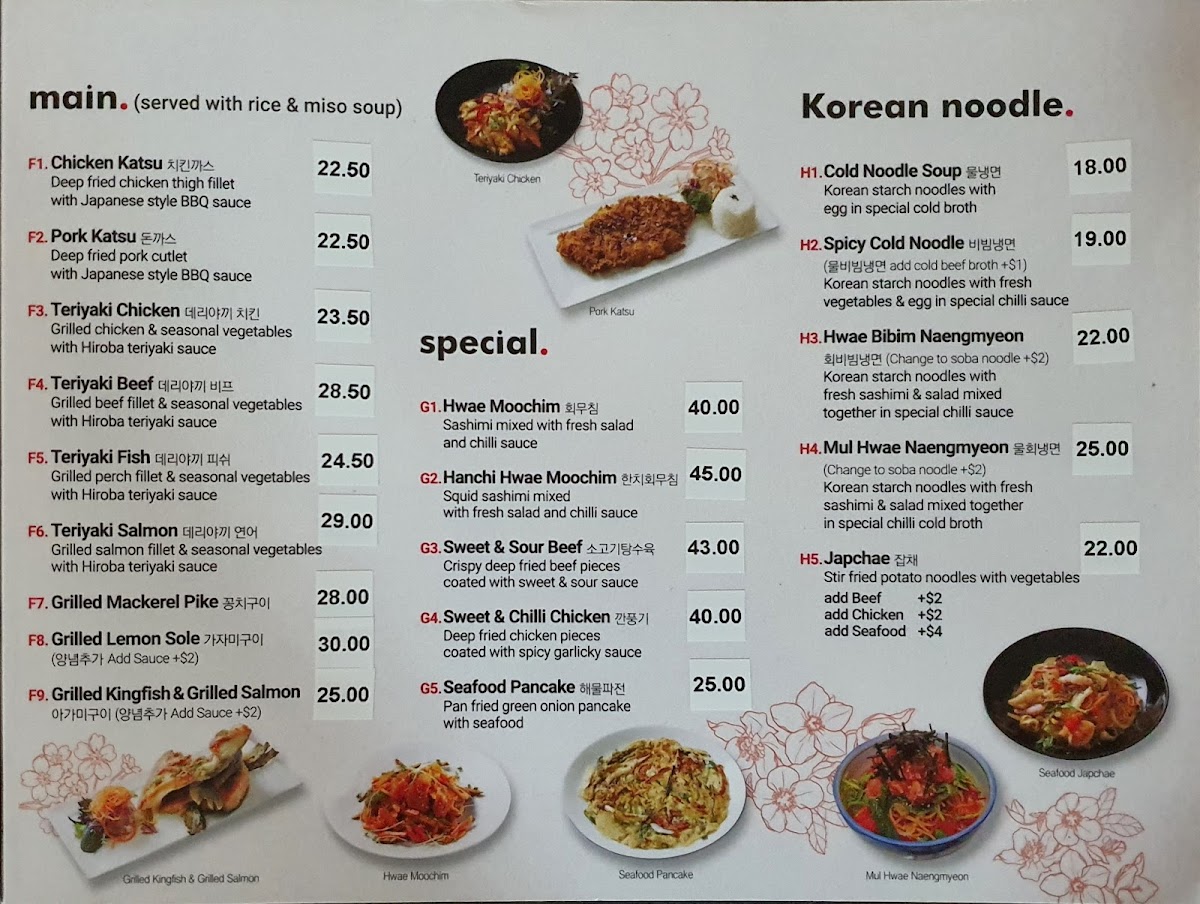 From a reviewer’s perspective, the menu at Hiroba Strathfield offers a wide variety of Japanese and Korean dishes that cater to different tastes, from light entrees to hearty main meals and set boxes. The entree selection includes King Prawn Tempura, Squid Tempura, Vegetable Croquette, Creamy Crab Croquette, and Green Seaweed Salad, which are great starters. The fried rice options such as Fried Rice, Kimchi Fried Rice, Chicken Fried Rice, Prawn Fried Rice, and Seafood Fried Rice provide flavorful and filling choices. For mains, dishes like Teriyaki Chicken, Teriyaki Beef, Teriyaki Fish, Teriyaki Salmon, and Pork Katsu are classic and satisfying. The hot pot and soup section features comforting dishes including 아가미매운탕, Jewfish Soup, Snapper Soup, Tuna Kimchi Soup, and Soft Tofu Soup. The lunch and dinner box options such as Tonkatsu Sashimi Box, Bulgogi Sashimi Box, 장어 사시미 도시락, Teriyaki Salmon Box, and Take Box are convenient and well-balanced meals. Noodle lovers can enjoy Vegetable Udon, Seafood Udon, Cold Soba, Hot Soba, and Odeng Udon, while Korean specialties like H3.Hwae Bibim Naengmyeon and H5.Japchae add variety. Rice dishes such as Bulgogi, Chilli Pork, Chilli Octopus, Chilli Squid, and Chilli Chicken are also available, along with Hwae Dobbap and Hanchi Hwae Dobbap. The sashimi and sushi section includes Natural Oyster & Salmon Sashimi, Fresh Natural Oyster, and sushi nigiri like Avocado, Inari, Tamago Egg, Flying Fish Roe, and Salmon Roe. Overall, the menu is diverse and satisfying, with many combination boxes like Sakura Box, Tempura & Sushi Box, Vegetarian Box, and Tempura & Sashimi Box offering great variety for diners.